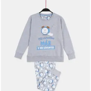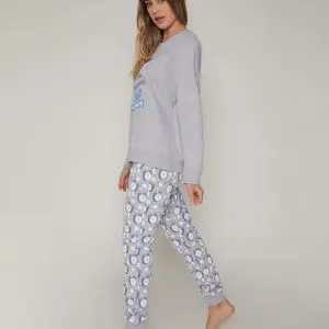 Pijama de punto de algodón, de manga larga, cuello redondo y pantalón largo. Camiseta de felpa vigoré (tejido tipo chándal de algodón), de color gris jaspe, con estampado personalizado de la marca Mr. Wonderful.