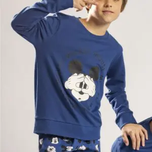 Pijama familiar de felpa y punto de algodón, de manga larga, cuello redondo y pantalón largo. En colores azul para hombre y niño y rosa para mujer y niña.